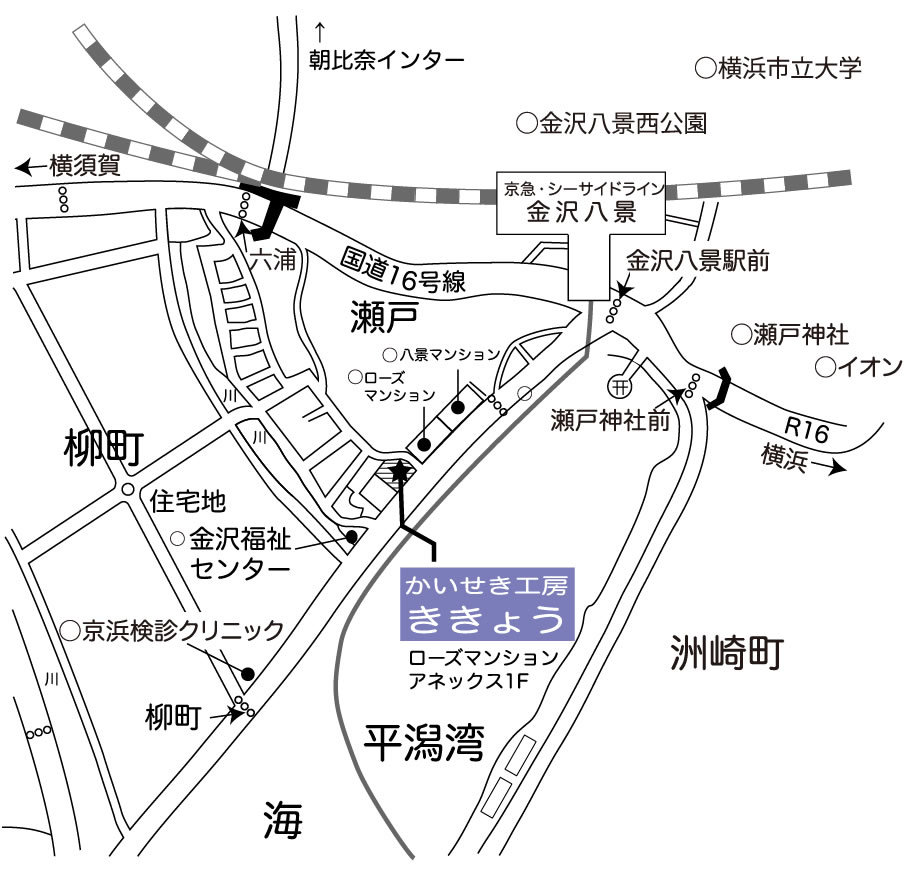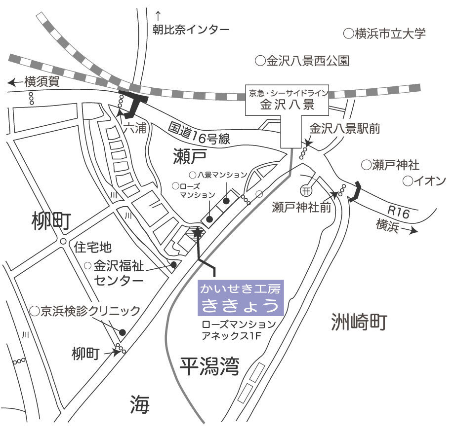 金沢八景駅前交差点を横断していただき、そのまま正面、平潟湾沿いに来ていただき、手押し信号横断歩道の辺りから海に面したマンションが3棟並んでおります。